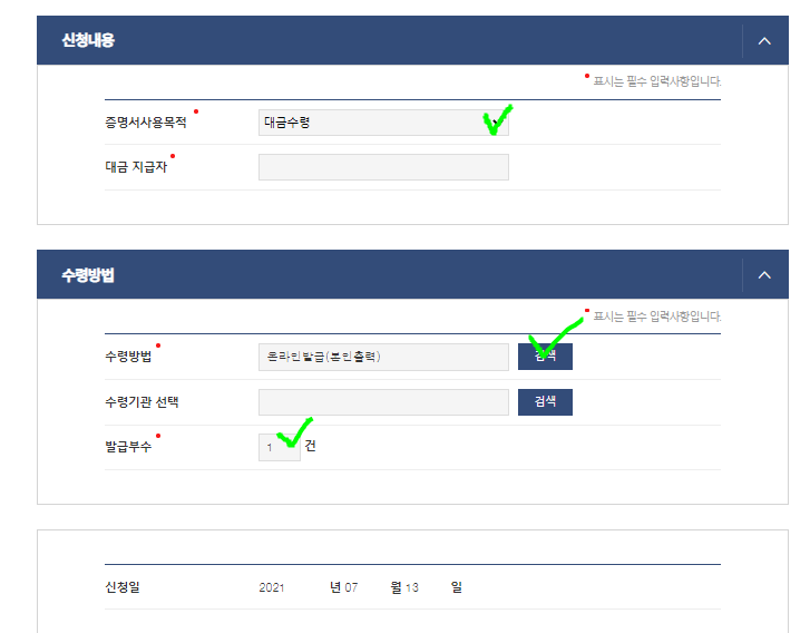어디서 출력할지를 선택 발급부수 선택 본인출력이 불가능할 경우