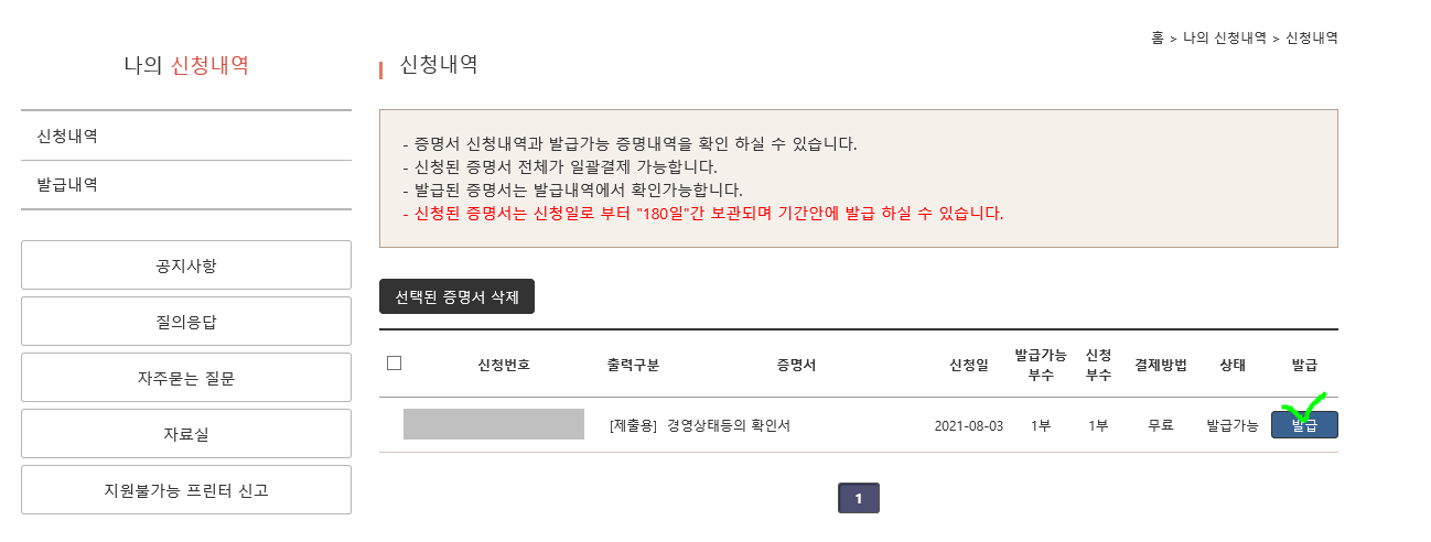 신청내역으로 바로 이동 되며 이동후에 발급 버튼을 클릭 하시면 출력가능합니다.