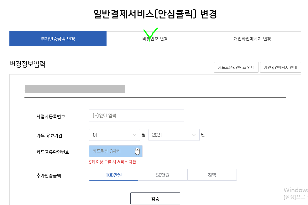 추가인증금액변경, 비밀번호 변경, 개인확인메시지 변경 시트중에 저는 비밀번호를 모르니 변경클릭