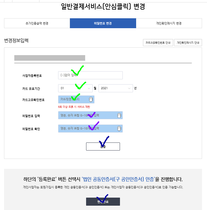 카드번호, 고유확인 번호 3자리 비밀번호 입력과 확인(숫자영문포함6~16자리)에 입력하고 검증클릭