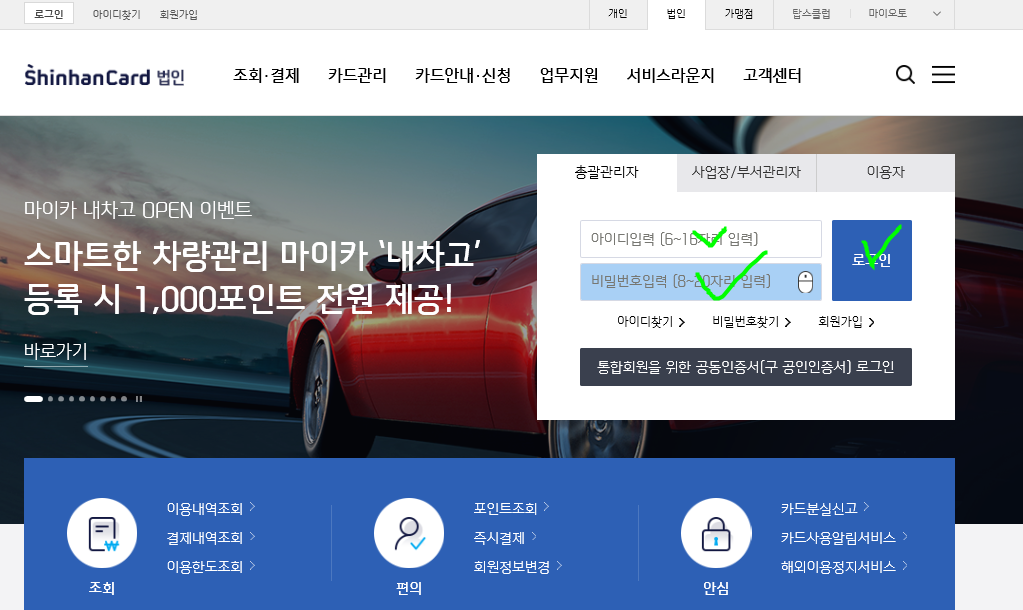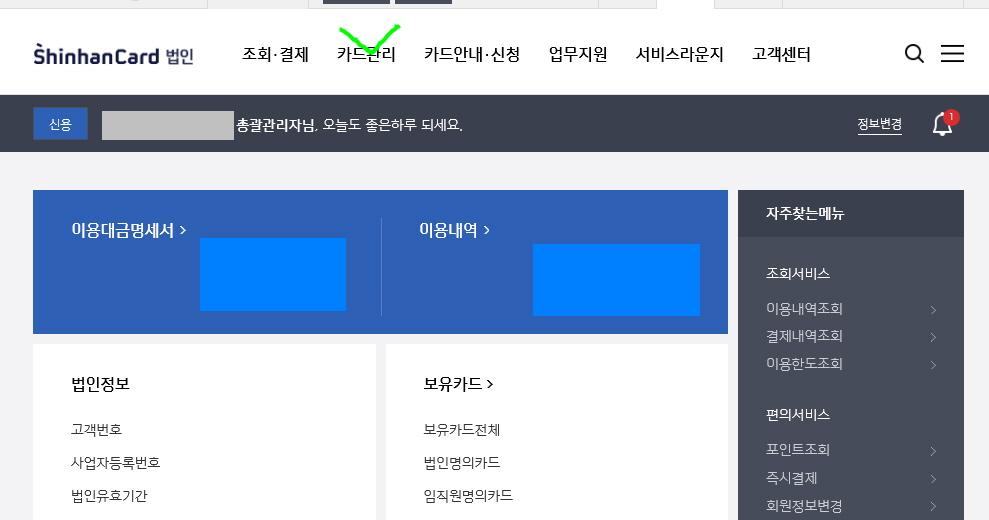 저희 회사는 신한카드라 신한카드로 예시를 작성하나, 다른 신용카드도 일반결제 등록후에 사용해주시면 됩니다.