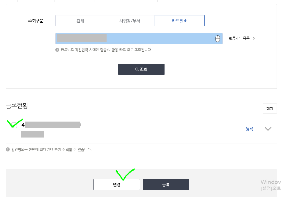 카드번호 조회 후 아래쪽에 이미 등록된 법인카드 등록현황이 뜹니다.