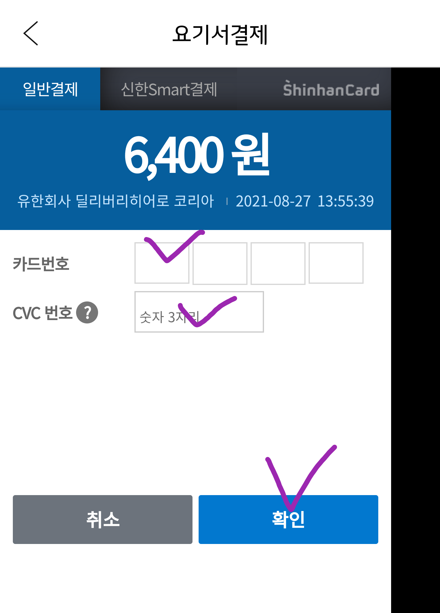 신용카드 번호 CVC번호 입력후 확인 클릭