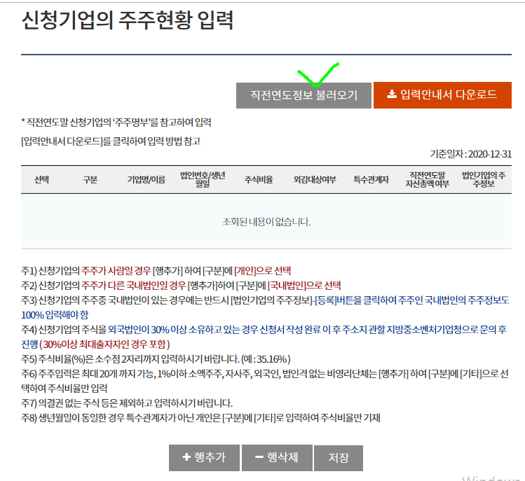 주주현황이 변경되지않았다면 직전연도 불러오기 클릭, 처음이시면 직접입력하시면 됩니다.
