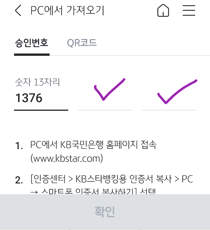 스마트폰 화면에 승인번호13자리를 입력하고 확인 클릭.