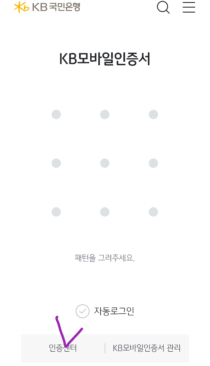 스마트폰에서 KB스타뱅킹 에 첫화면에서 인증센터 클릭.