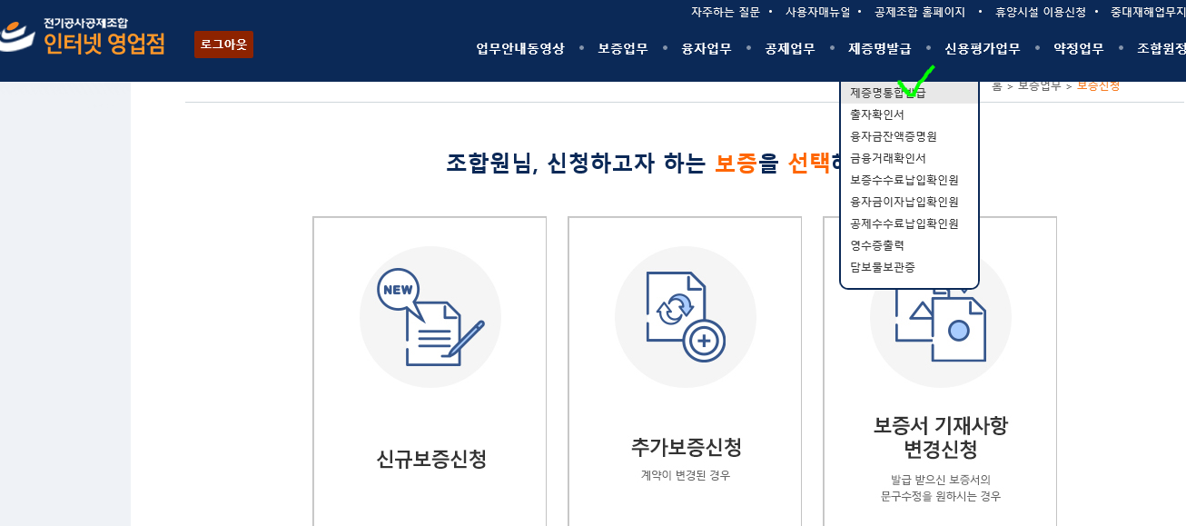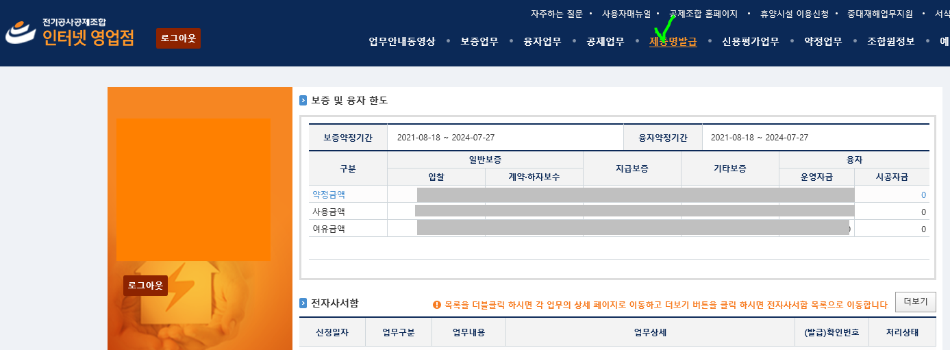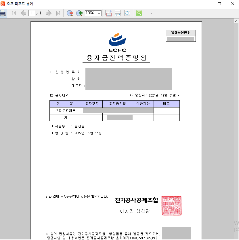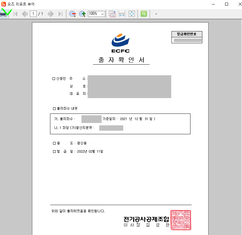전기공사공제 조합 인터넷영업점 에서 출력가능합니다.