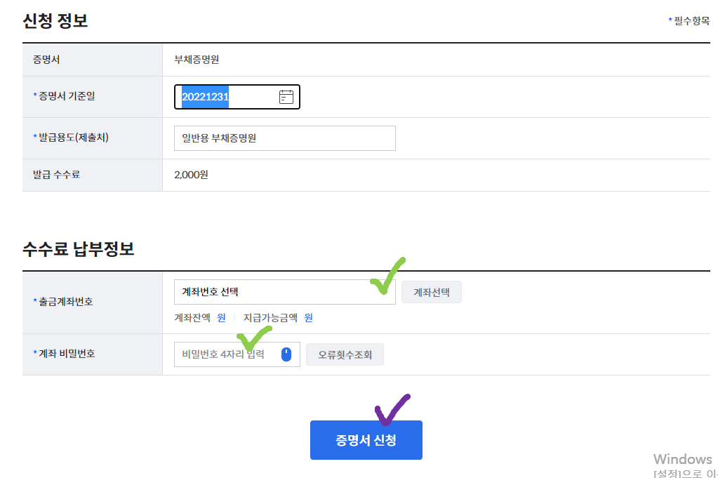 수수료 납부계좌 선택 비밀번호 입력후 증명서 신청