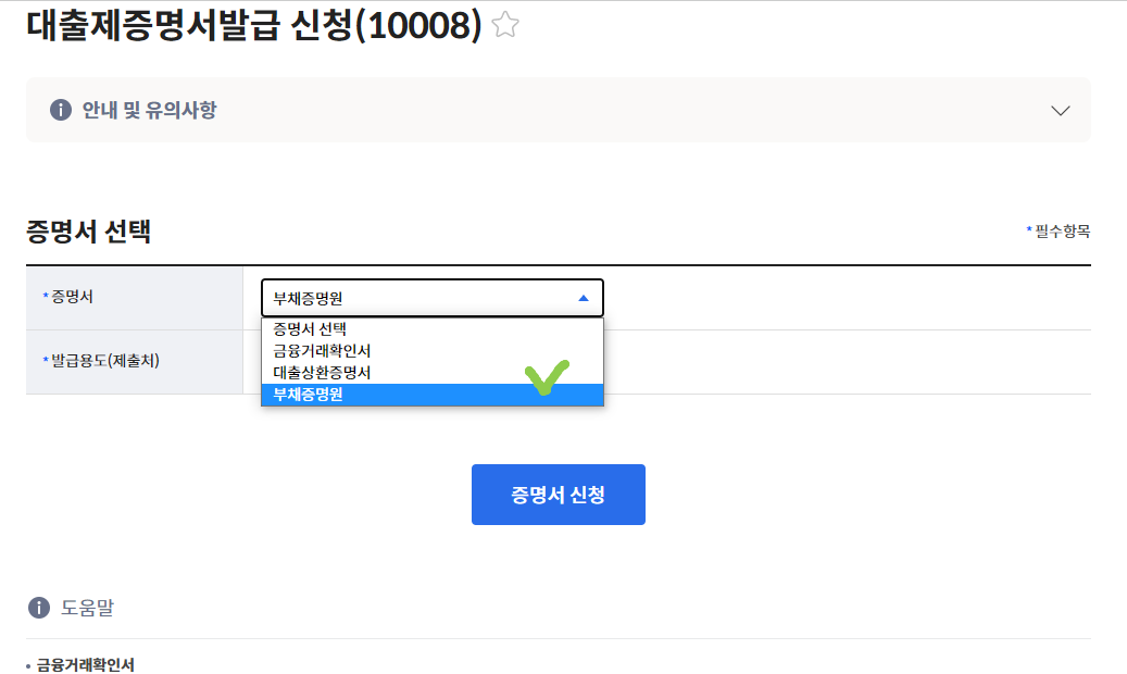 일반용 부채증명원 증명서 신청