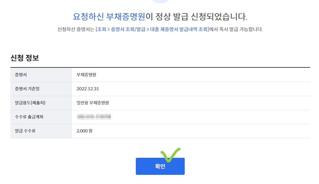 부채증명원 발급수수료 2000원 출력하시면 끝