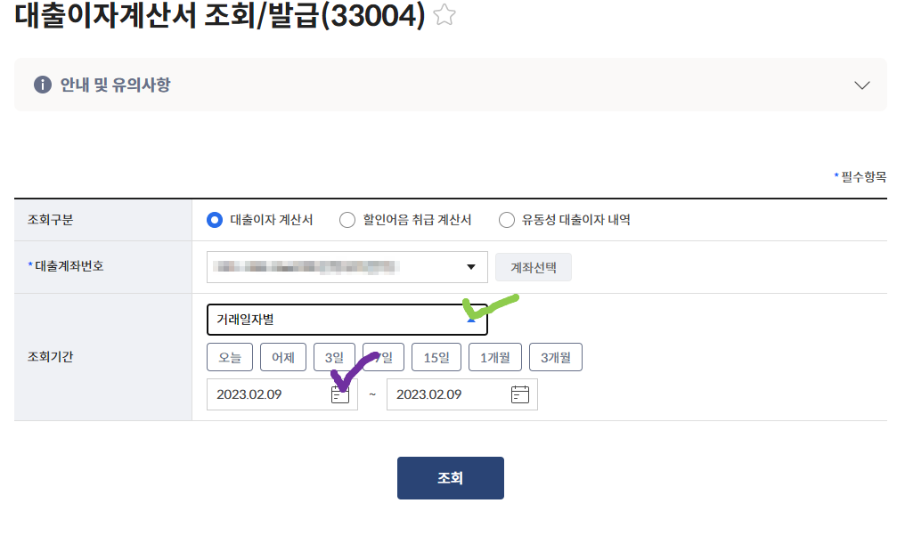선택후 대출이자계산서 발행 클릭