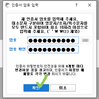 갱신할 인증서를 클릭하고 인증서 암호 입력 확인을 눌러주세요.