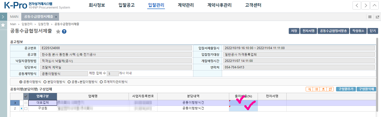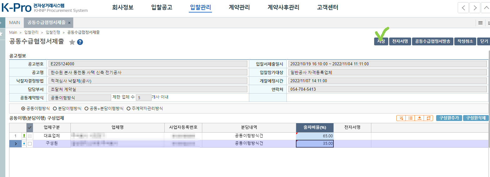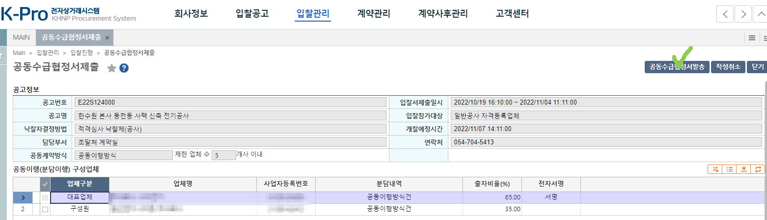구성원 업체가 서명을 하면 최종제출 할수있어요.