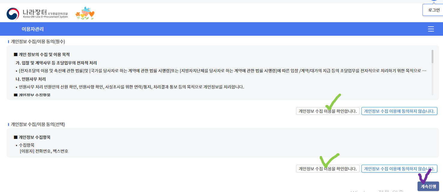 개인정보 수집 이용을 확인 여부를 선택후 계속진행 클릭